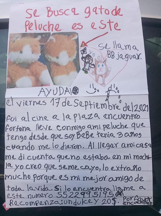Niña ofrece un dulce y 20 pesos de recompensa por peluche extraviado