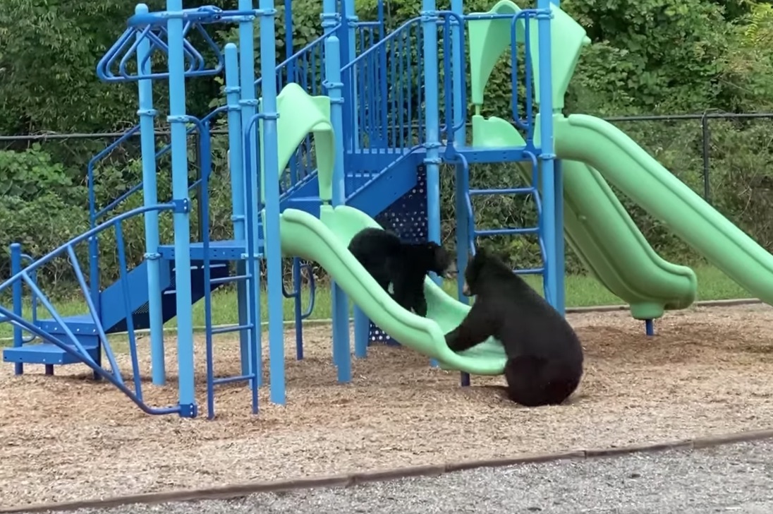 Mamá osa enseña a cachorro a usar resbaladilla