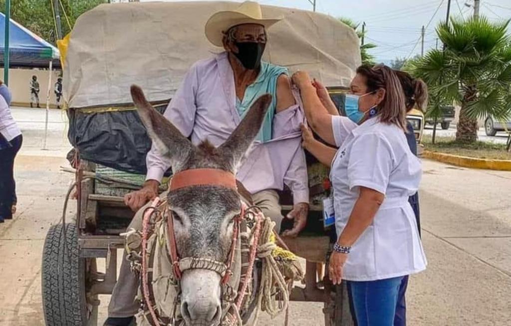 Hombre llega con su burrito a vacunarse