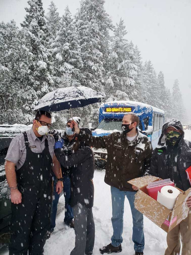 Personal atrapado por la nieve en carretera reparte vacunas Covid-19