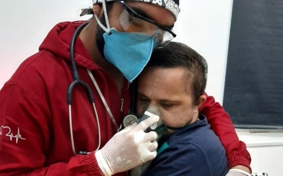 Enfermero calma con abrazo a paciente con Down enfermo de Covid-19