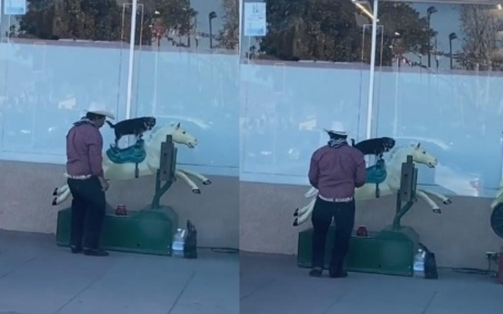 VIDEO. Hombre pasea a su perrito en caballo mecánico