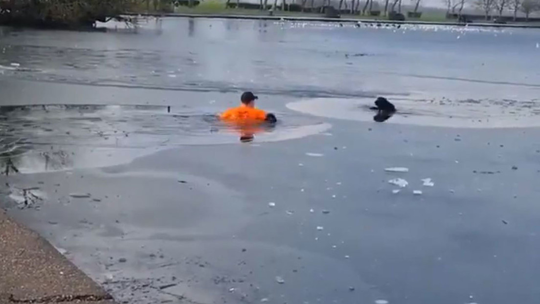 VIDEO: Hombre se lanza a lago helado para salvar perrito