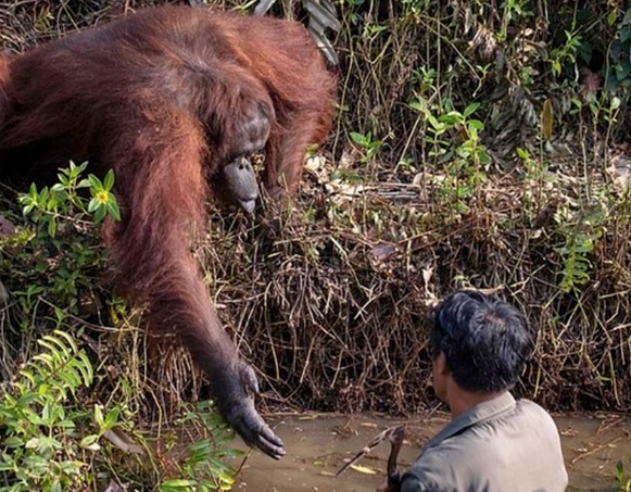 Orangután intenta ayudar a hombre que creía atrapado