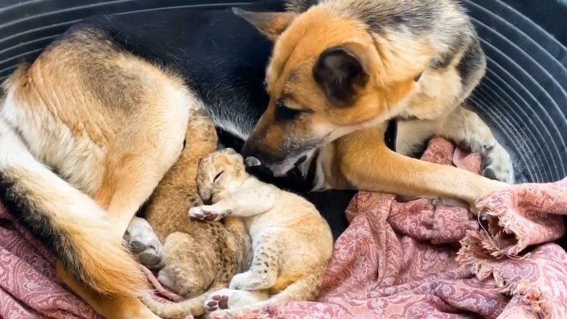 Perrita adopta cachorros de león