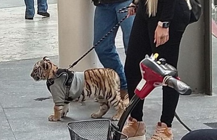 Mujer pasea cachorro de tigre en plaza de CDMX