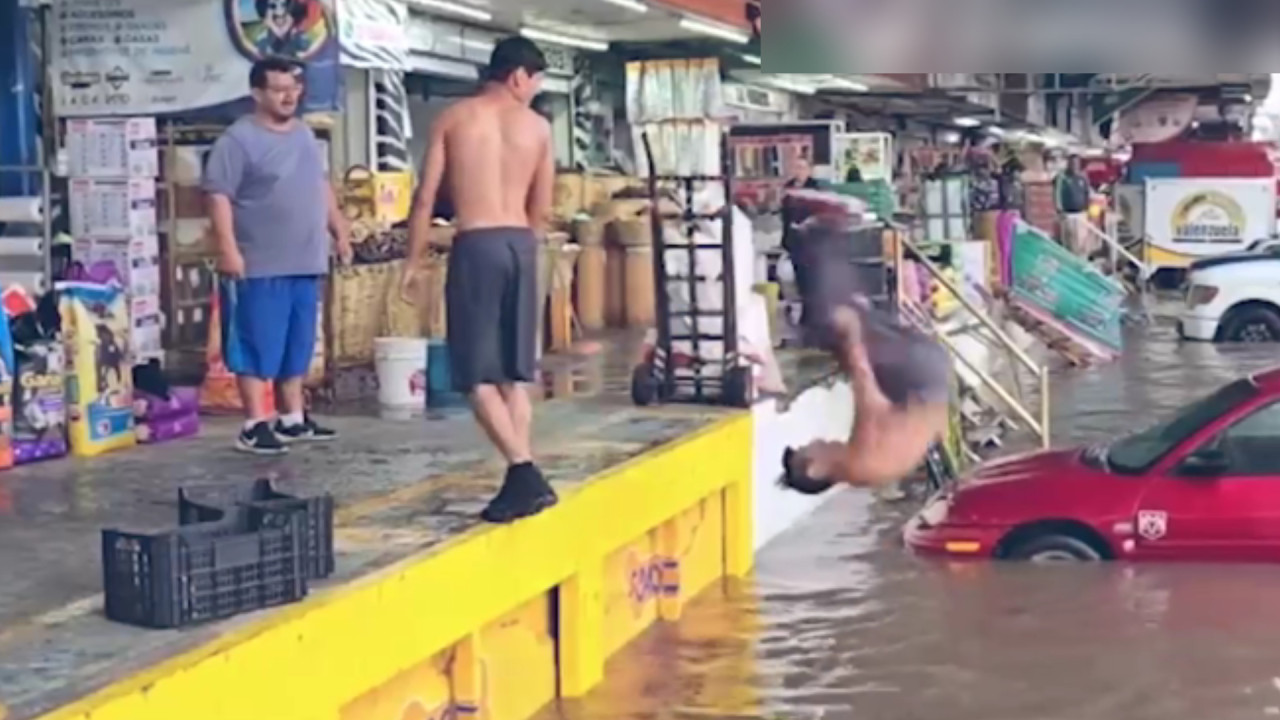 Jóvenes hacen clavados en Mercado de Abastos en Guadalajara tras inundaciones
