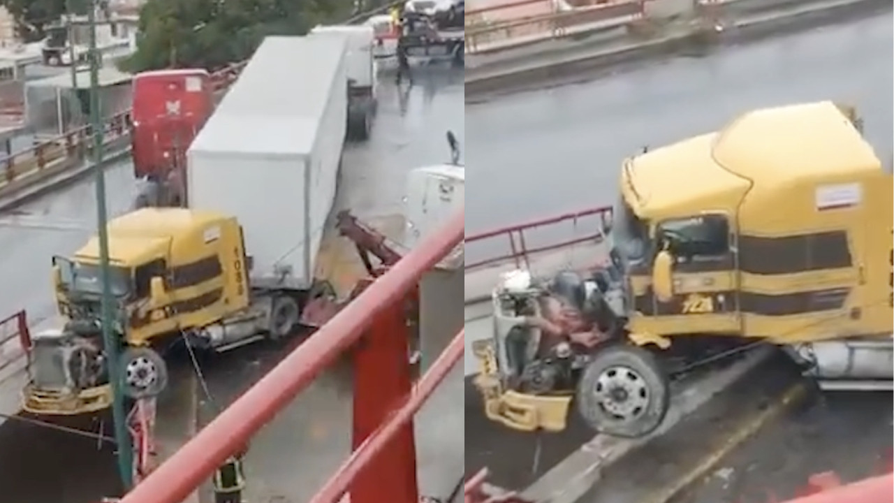 Tráiler queda colgando en puente de Edomex tras perder el control