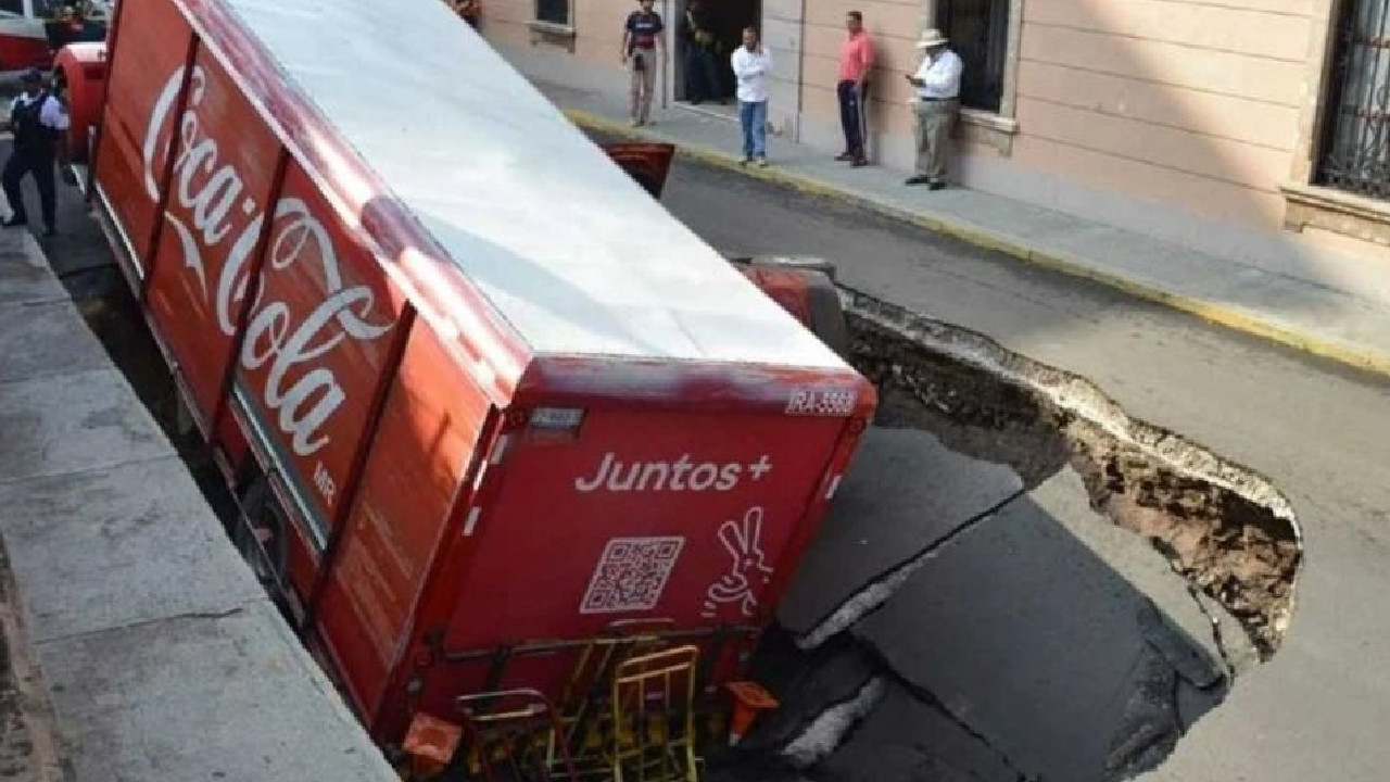 Familia y camión refresquero caen en socavón en Irapuato
