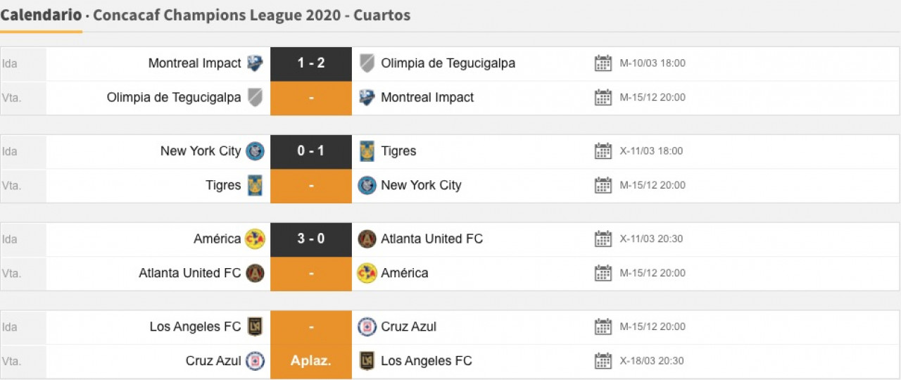 En esta etapa de cuartos de final también jugarán el mismo día el Olimpia de Tegucigalpa contra el Montreal Impact, y el América contra el Atlanta United FC.