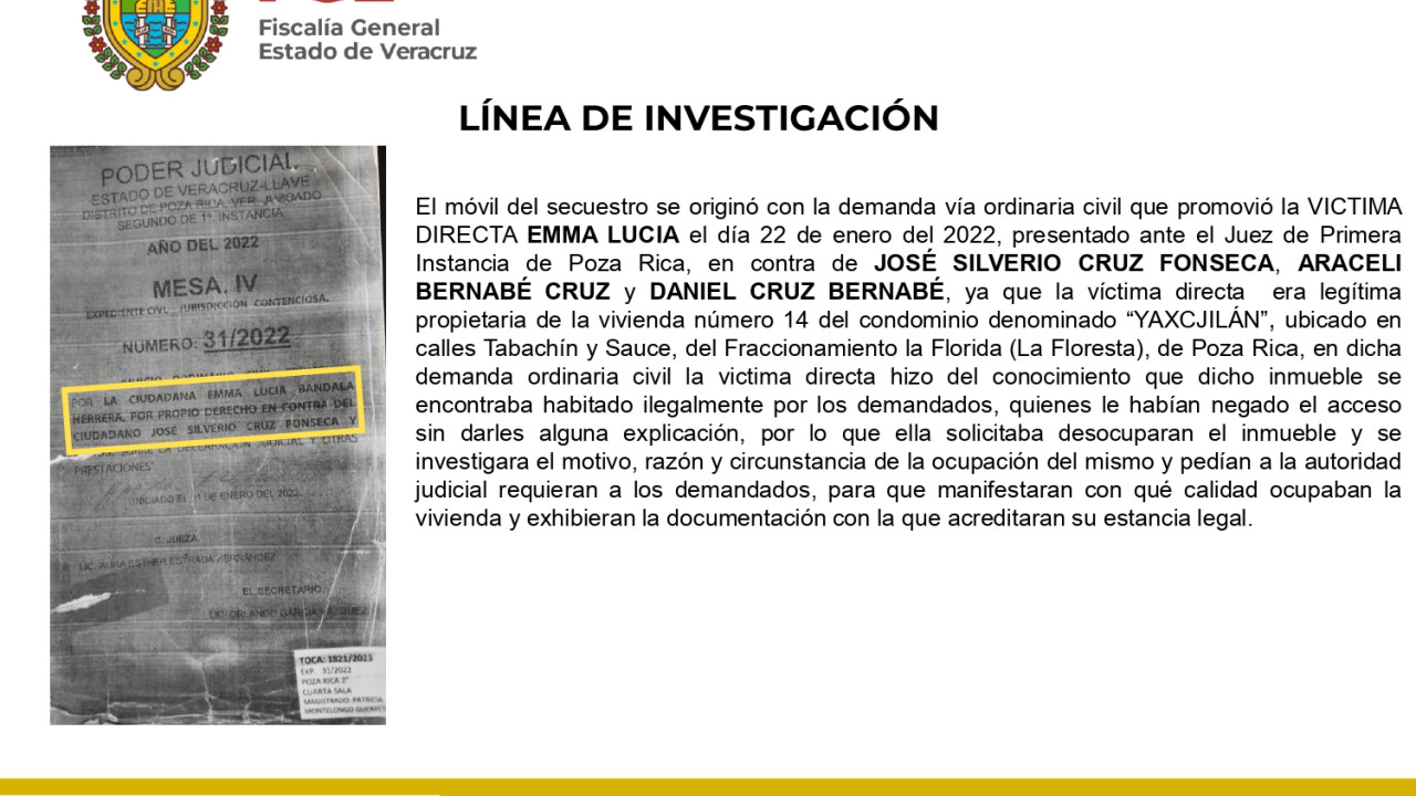 "El móvil del secuestro se originó con la demanda vía ordinaria civil que promovió la VICTIMA DIRECTA EMMA LUCIA el día 22 de enero del 2022", se lee en la presentación de la Fiscalía.