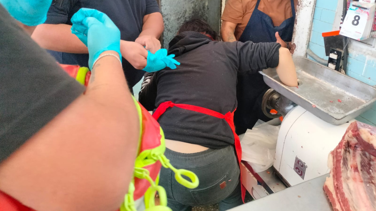 Mujer queda atrapada en molino de carne