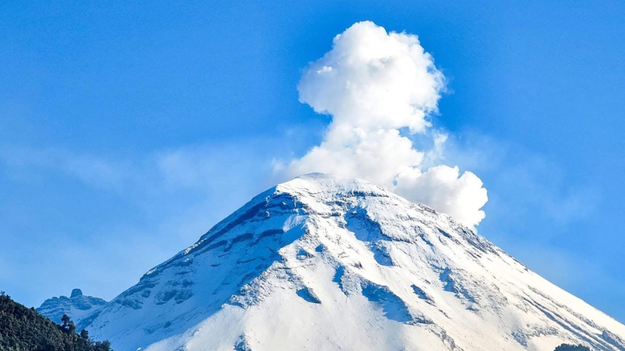 El Popo se pone en modo Navidad; amanece con nieve y ceniza